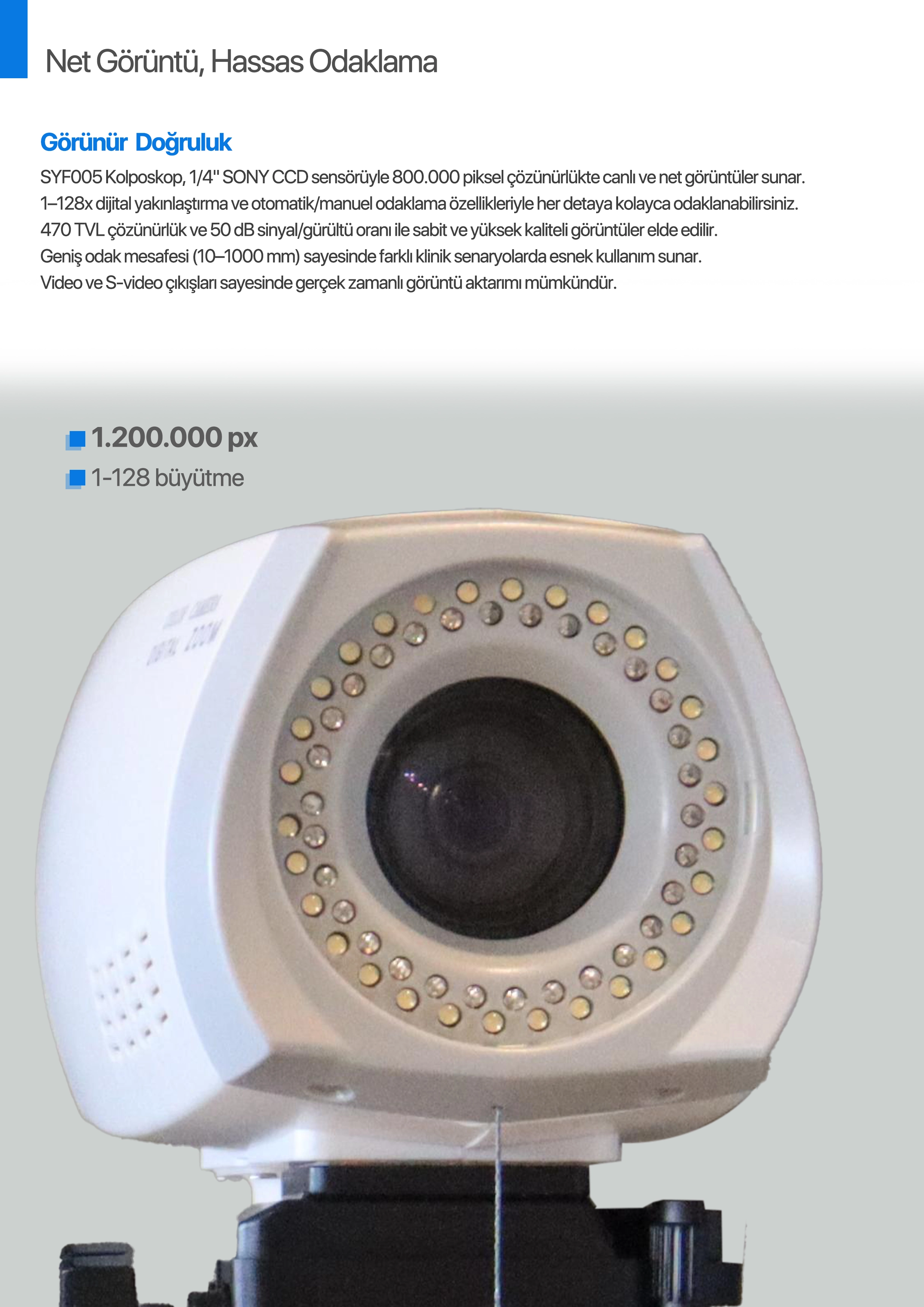 Görüntü Sensörü: SONY renkli dijital CCD,1.200.000 piksel Yakınlaştırma: 1 ila 128 kat arası sürekli değişken büyütme Lens Çözünürlüğü: 1/4" Super HAD renkli CCD Görüntü Çözünürlüğü: 470 TVL (satır) Sinyal/Gürültü Oranı (S/N): 50 dB Odak Mesafesi: Standart: 100 ~ 400 mm Geniş destek aralığı: 10 ~ 1000 mm Tarama Aralığı: 2,5 mm – 320 mm Alan Derinliği: 15 mm – 480 mm Yakınlaştırma Aralığı: 1 ~ 128 Odaklama: Otomatik (AF) / Manuel (MF) Beyaz Dengesi: Otomatik (AWB) Görüntü Çıkışı: Video, S-video, PAL formatı Aydınlatma ve Görüntü Kalitesi Işık Kaynağı: Yüksek parlaklığa sahip beyaz LED halka ışık Parlaklık: Geleneksel halojen lambalara göre %60 daha fazla Renk Sıcaklığı: Süper ve dengeli beyaz ışık Işık Ömrü: Ortalama 100.000 saat Filtreleme Teknolojisi: Özel olarak tasarlanmış görüntü halesi filtreleme ile net görüntü Renk Canlılığı: Gerçek ve canlı renk desteği Depolama ve Yazılım Özellikleri Bellek Kapasitesi: Maksimum 1 milyon vaka saklama kapasitesi Görüntü Yönetimi: Normal klinik görüntülerin kolay saklanması Tanı raporu dışında video ve gerçek renkli görüntü desteği Teşhis sözcüklerinin kolay düzenlenmesi ve bakımı Vaka ve istatistiklerin rahat kontrolü Kullanım Alanı Bu cihaz, vulva, vajina ve serviks bölgelerindeki patolojik değişikliklerin incelenmesinde kullanılır. Ayrıca, serviks kanserinin dolaylı floresan filtreleme yöntemiyle tespitinde ve görüntü yönetiminde etkili bir araçtır.